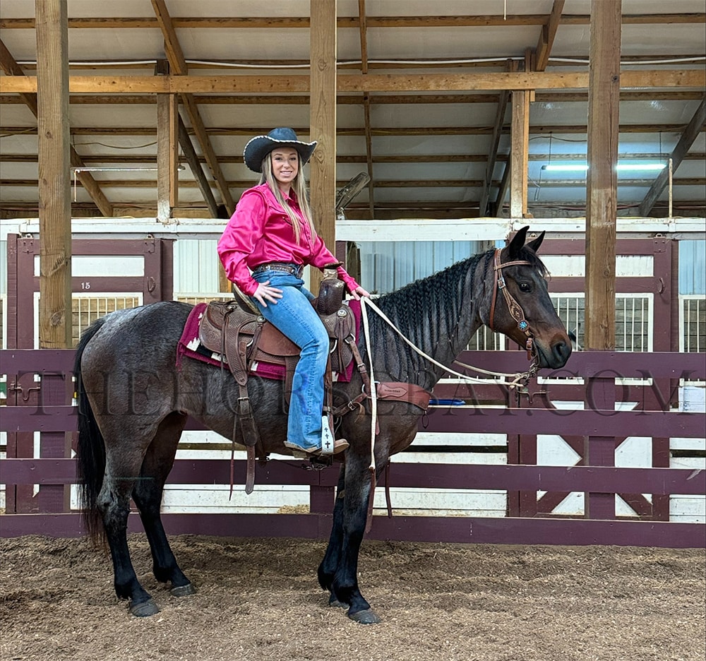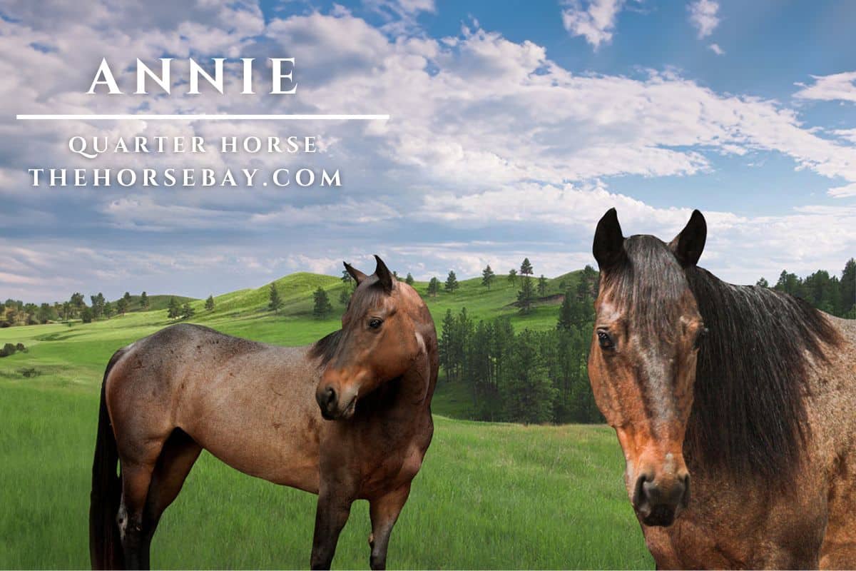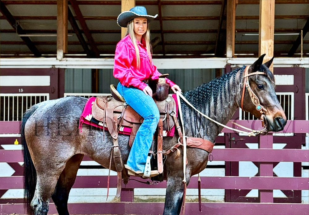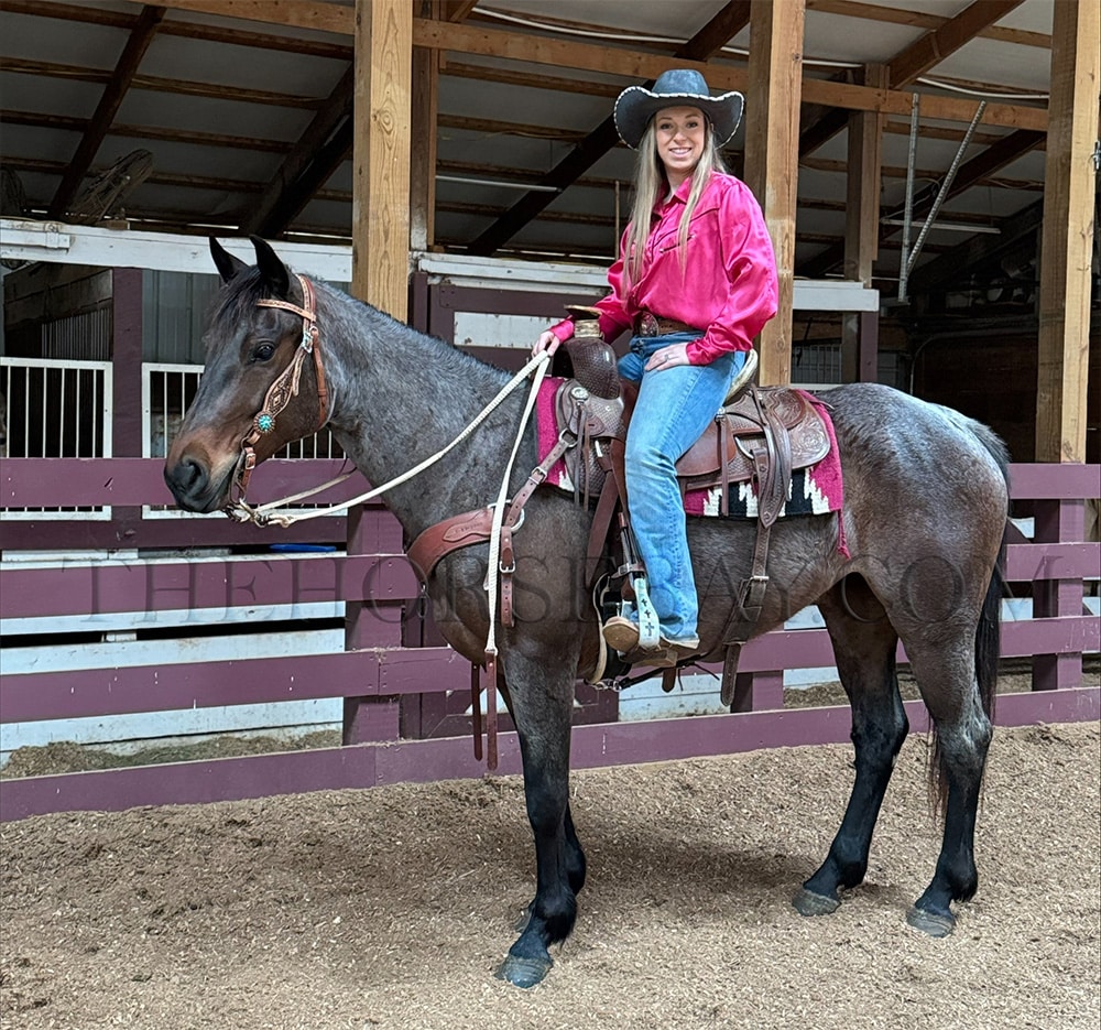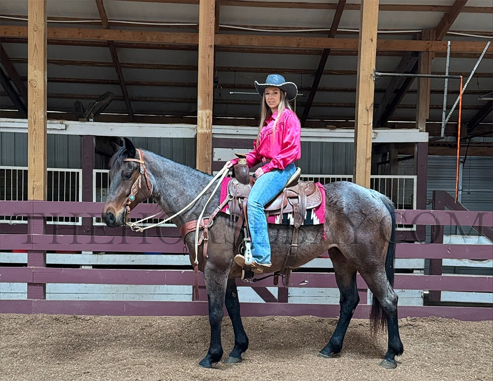 Annie is a captivating 7-year-old bay roan Quarter Horse mare with a sleek coat that shimmers under the sunlight. Standing at a graceful 15 hands, she embodies elegance and strength in every step. Her training is nothing short of remarkable, earning her the title of “fancy broke.” She effortlessly performs a 20-foot reining horse slide, showcasing her agility and precision, and has already begun mastering the art of reining spins, displaying her potential for excellence in this discipline.