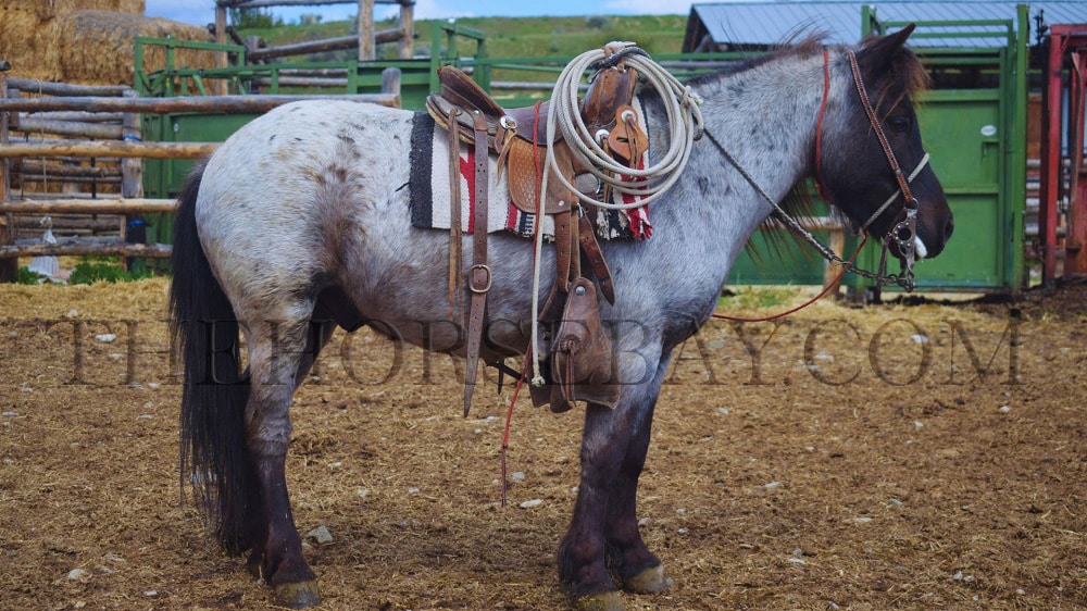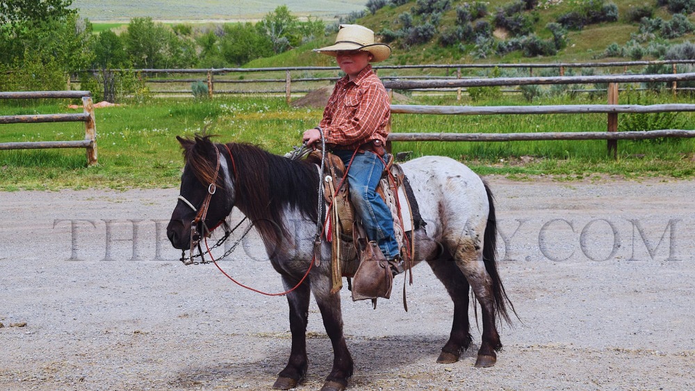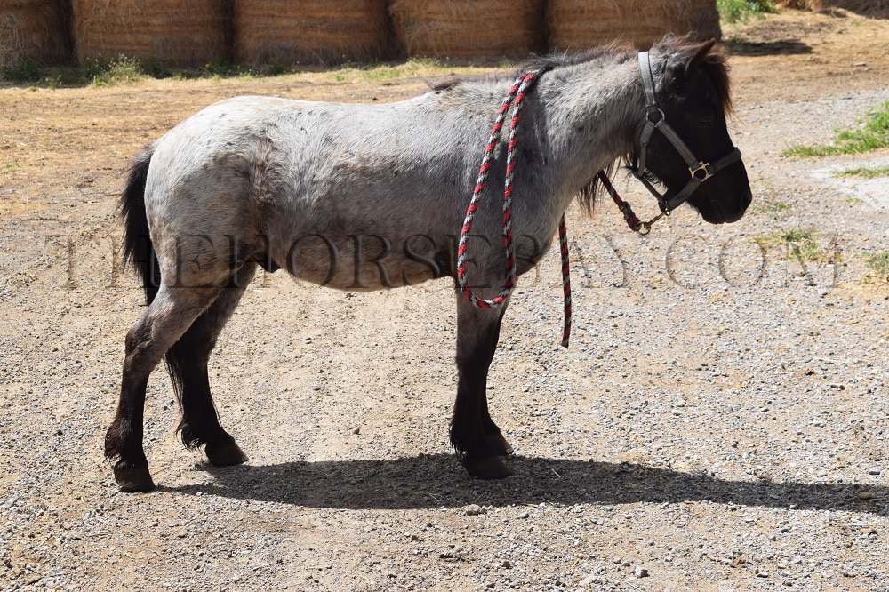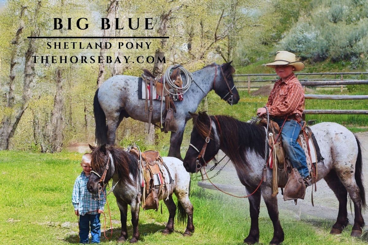 Big Blue is a handsome 6-year-old Shetland Blue Roan gelding. He’s one of the coolest-looking ponies we have raised. He has been trained on our working cattle ranch, which has resulted in a highly skilled, gentle, and handy pony. Some of his skills include riding range, moving and sorting cattle, roping and branding, and trail riding. His gentleness and calm demeanor are his most valuable qualities. We have had every age of children on him, and he takes great care of them all. He stands still when being mounted and moves out when asked. He has a great stop on him. He has been raised around children, other animals, traffic, farm equipment, motorcycles, four-wheelers, bicycles, etc., and is not bothered by any of these things. While calm and well-mannered, he is tough and can pull and work. He easily crosses bridges, climbs mountains, rides trails, and crosses water. He goes and goes without tiring. He has participated in parades, rodeos, and carnivals. He is phenomenal with children- the ultimate pony- he is easy to catch, trim, saddle, bridle, easy to load. We have had many quality ponies come and go on the ranch, but Big Blue is one of a kind.