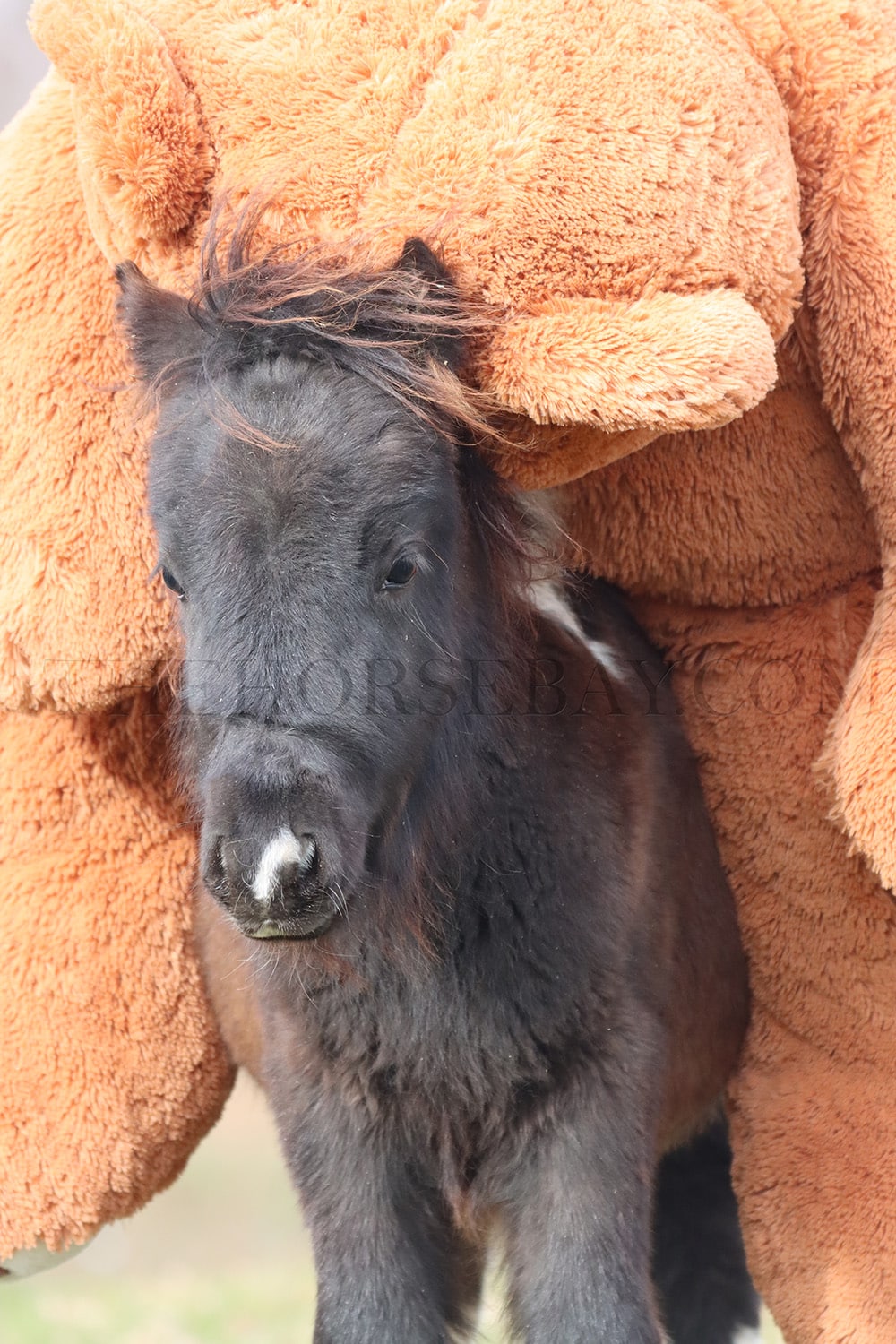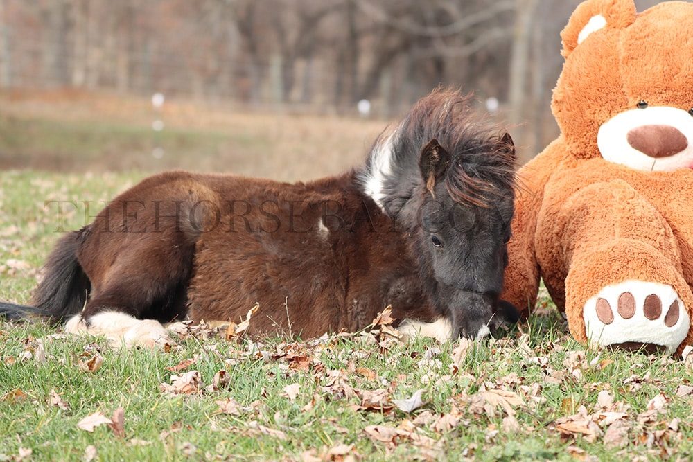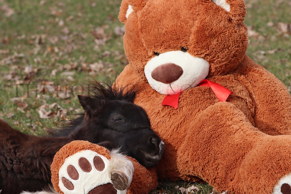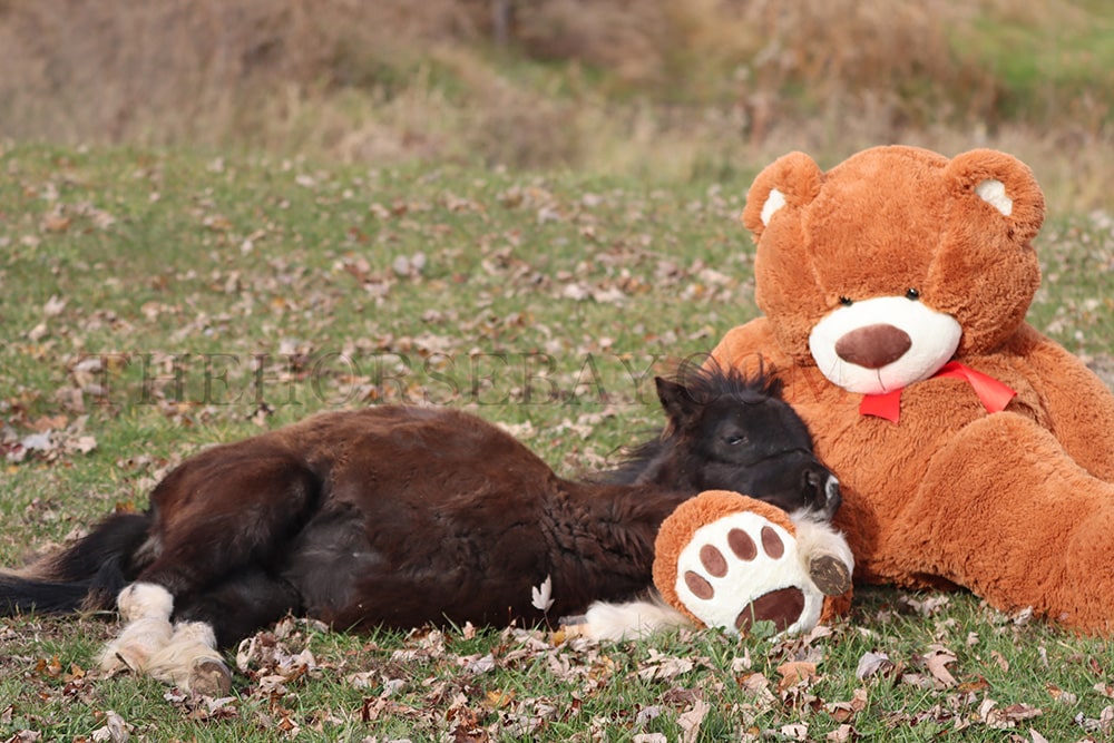 The photo of her sleeping with the big teddy bear should show how quiet she is. She actually fell asleep with him while we were getting photos of him sitting next to her. It was super adorable. And she will even sit like a dog sometimes. She is going to be very easy to break out when she’s old enough. I could see her being a driving/riding pony for some fortunate youngster. Or even a therapy pony she’ll go anywhere you lead her she is just such a sweetheart.