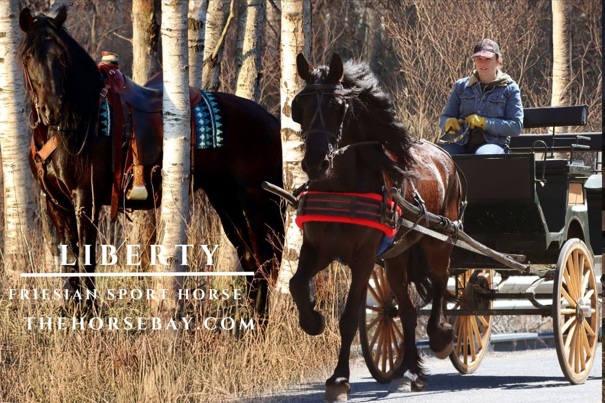 Check Out My Resume, aka Liberty, and you will want to check out her resume because she’s the real deal! She’s a registered Friesian Morgan Sport Horse. She stands (Sticks) at 15.3 hands tall and has a heavier build with thick legs, allowing her to carry a bigger rider or pull a heavier load easily.
