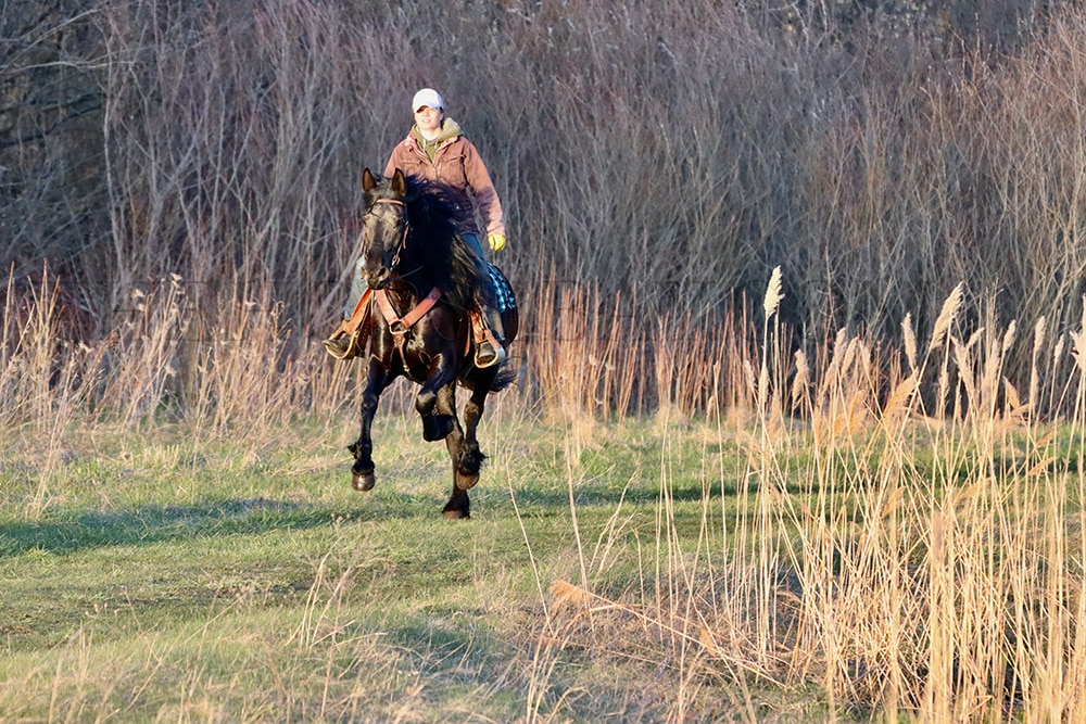 She is an easy keeper, stands still for the Ferrier, is easy to catch, and gets along out in the herd. She stands still for mounting and knows the come-over cue, so she will sidle over to you for you to get on. She’ll also lay down for mounting or dismounting. She can also sit down if you have a pile of hay or sawdust for her to sit on. She will ride very well off of your legs enough so that you don’t need to use the bridle much. She side passes, and you can open and shut gates off of her back.