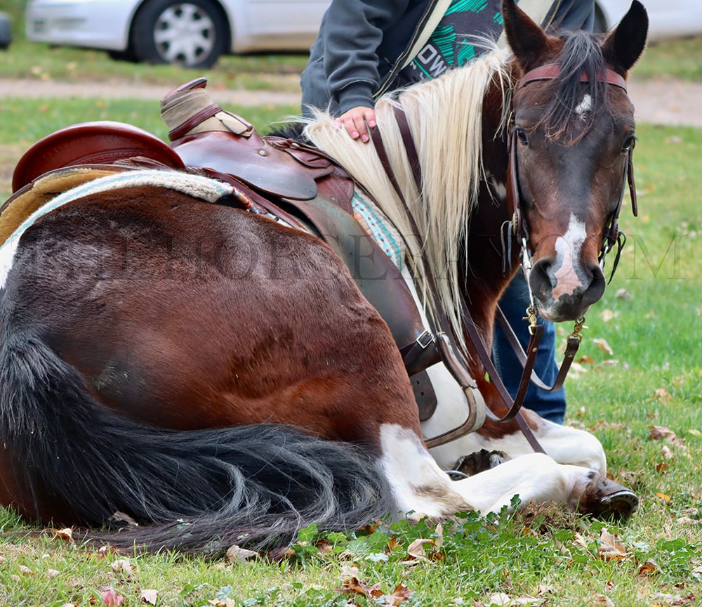 She has good ground manners. Stands still for tacking, mounting, and the farrier. She loads in the trailer, backs right out, and hauls good. For mounting, she knows the come over cue, whether you are on a mounting block or out in the woods on a log. Can’t find a stump or log, NO problem. Cowgirl knows the lay down cue and will lie down for you to get on. She can also lie down to get off as well.