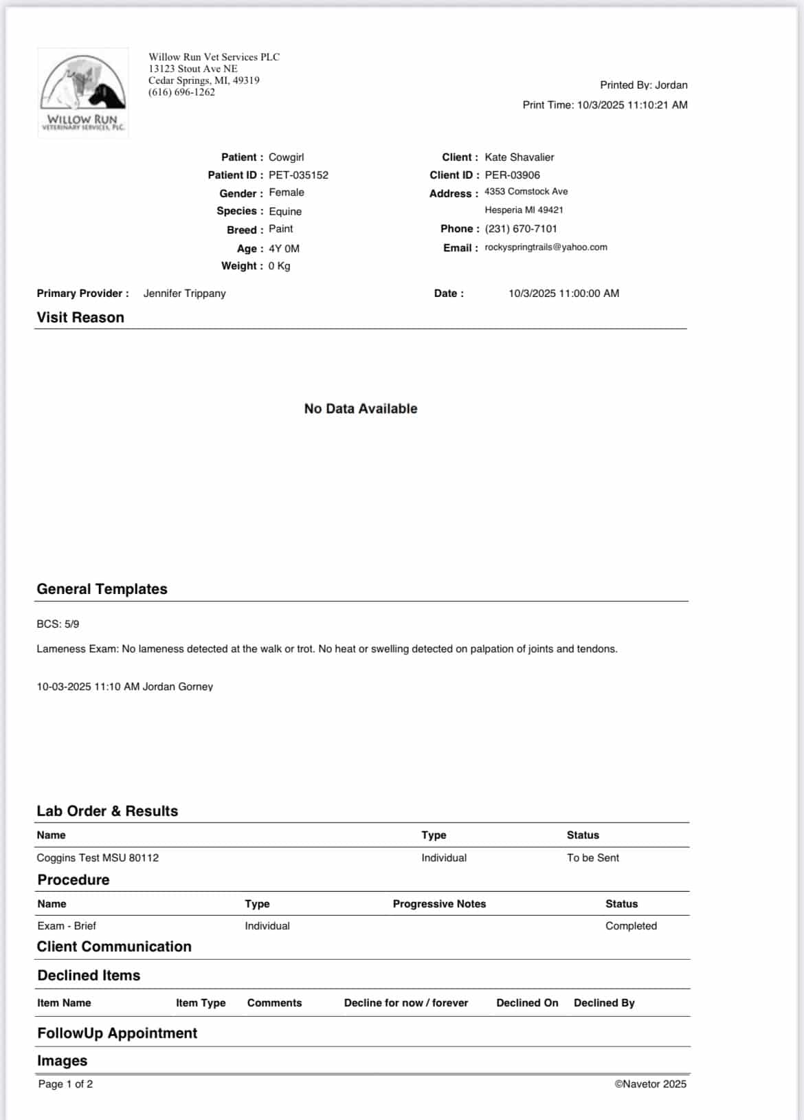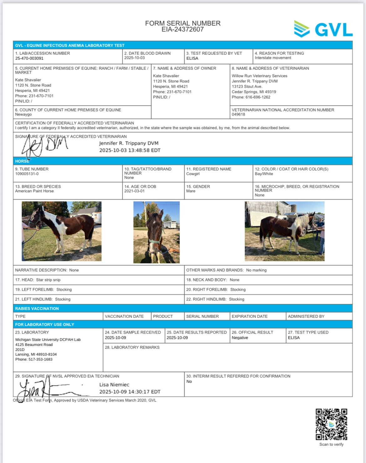 She comes up to date on farrier, vaccines, dewormings, coggins, and a vet check. Cowgirl did have a small bump on her back right leg when I got her. It has never bothered her, but I had X-rays done on it to make sure it’s not something to worry about. And in the vet’s own words, it’s a blemish. It’ll always be there and does not affect her in any way. We also had a pre-purchase lameness exam, and she was found healthy with no lameness. And she’s been on 10-plus-mile trail rides and can also do a full day of roping cows, and NEVER gets sore.