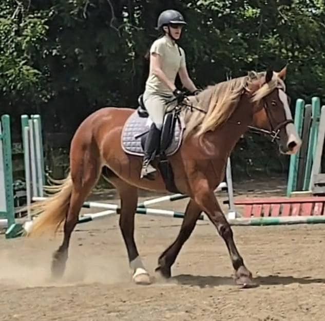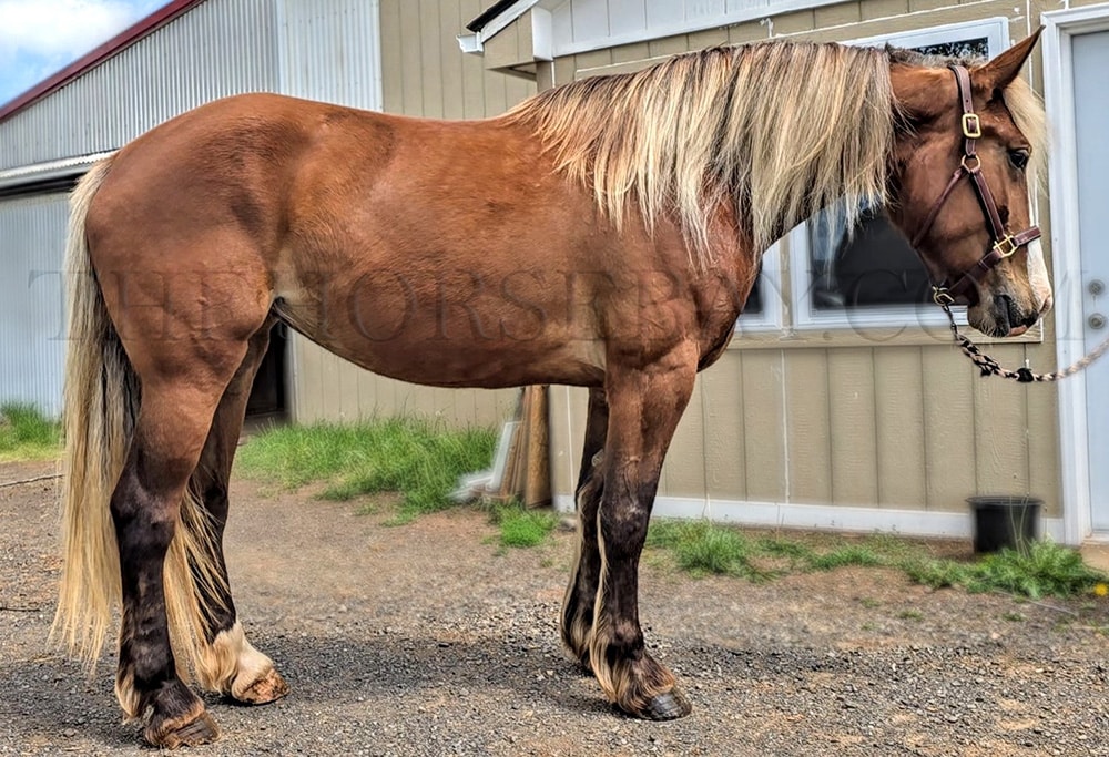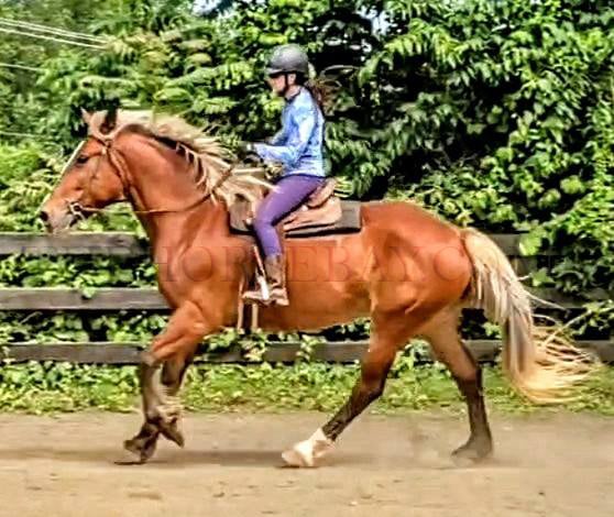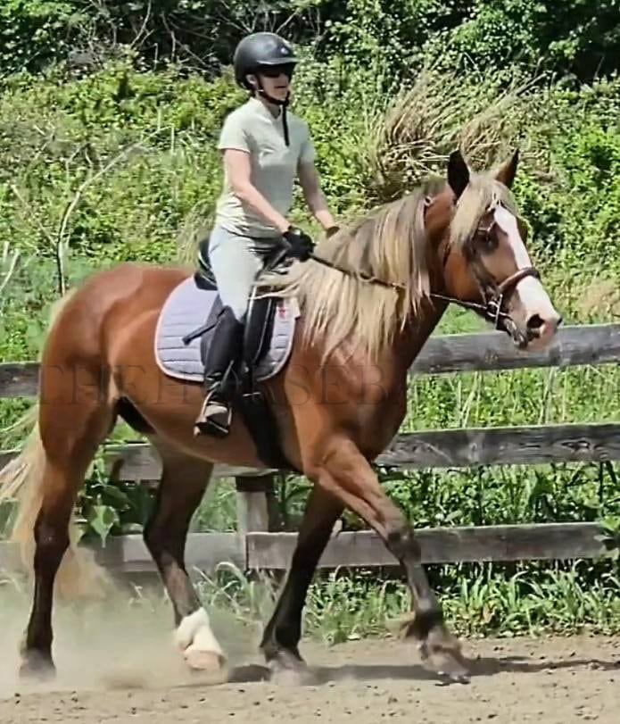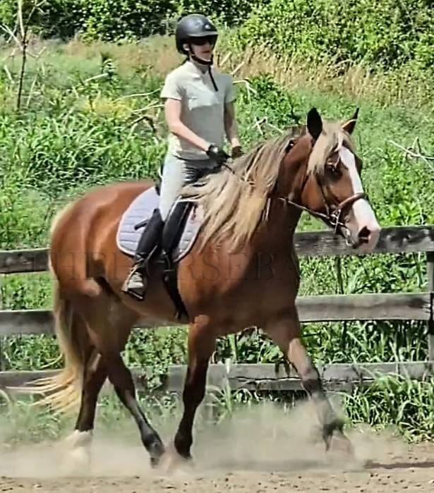 Dolce is the ultimate dream draft cross mare! This beautiful girl is a very rare and stunning Silver Bay. Silver Bay is a type of bay that causes the stockings to be a lighter color and the mane and tail to come in silver, cream, and white hairs. It is extremely rare in draft cross-bred horses; Dolce is one of a kind! Combined with a large, big blaze, white sock, dapples, and feathers, Dolce is the ultimate beauty queen, and I don’t think you will find another horse like her! Dolce is a sweet girl who loves to be doted on, stands patiently for baths and grooming, is easy to catch, and loves her beauty time. Under saddle, Dolce is an athletic horse, despite her large size, and is easy to ride. She is not wiggly, moves off the leg, and is responsive to cues. She is a beautiful and airy mover with a very smooth and effortless canter and a pretty trot. Her canter is so comfortable and effortless. She picks up her correct leads easily and will lope small circles without issue. She has a good whoa, and we ride her in a simple snaffle. Despite her size, she can be ridden by both smaller riders and larger riders, as she is responsive and not clunky or difficult to get going. She is a large horse, standing at 16.3 hands high, and has a strong, correct build.