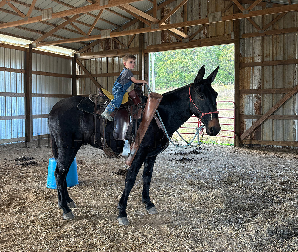 Ben will side pass up for you to mount or dismount. Stepstool ladder, bucket, mounting block, fence gate, log, concrete boulder, or tailgate. He would be a great hunting mule. He’s wonderful with dogs around him and pays them with no mind. Ben willingly picks up all four feet and stands quietly for the Ferrier, clipping, tacking up, and bathing. He loads in the trailer with no issues and backs out perfectly. The kids can even load and unload him. He also hauls quietly and stands quietly with a no-nonsense pawing or an anxious attitude about him. He is just truly a wonderful mule to be around.