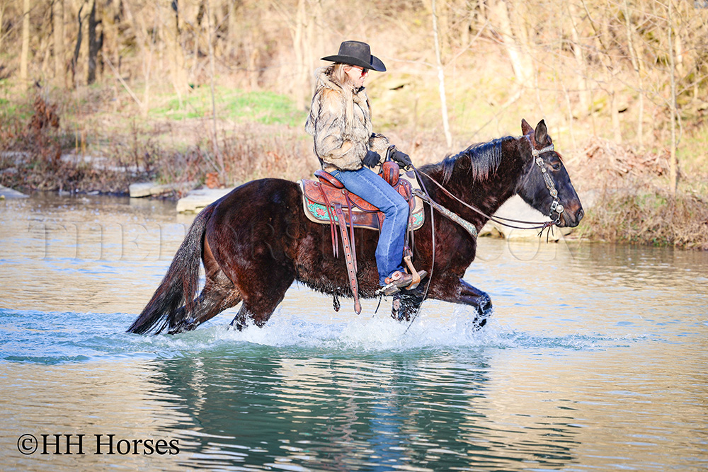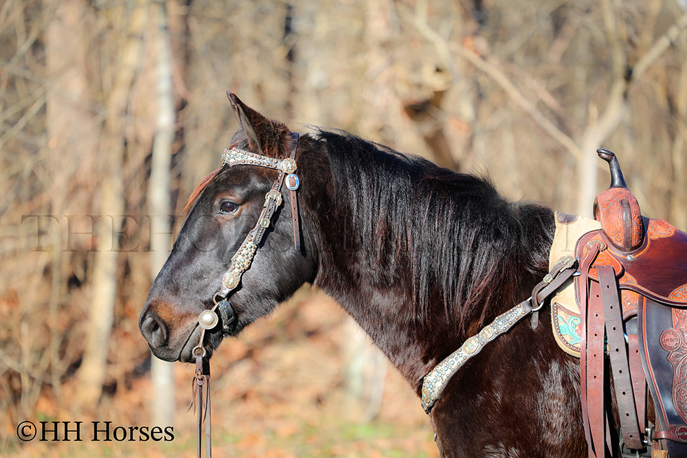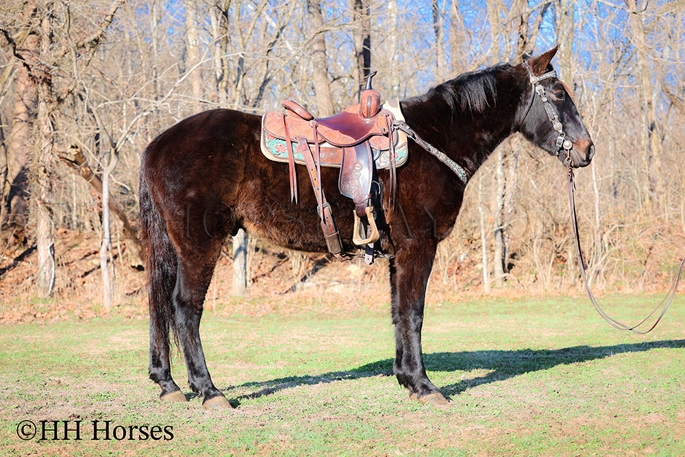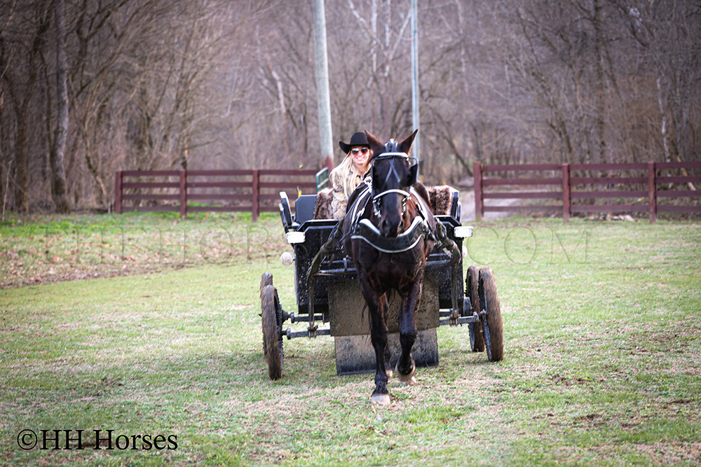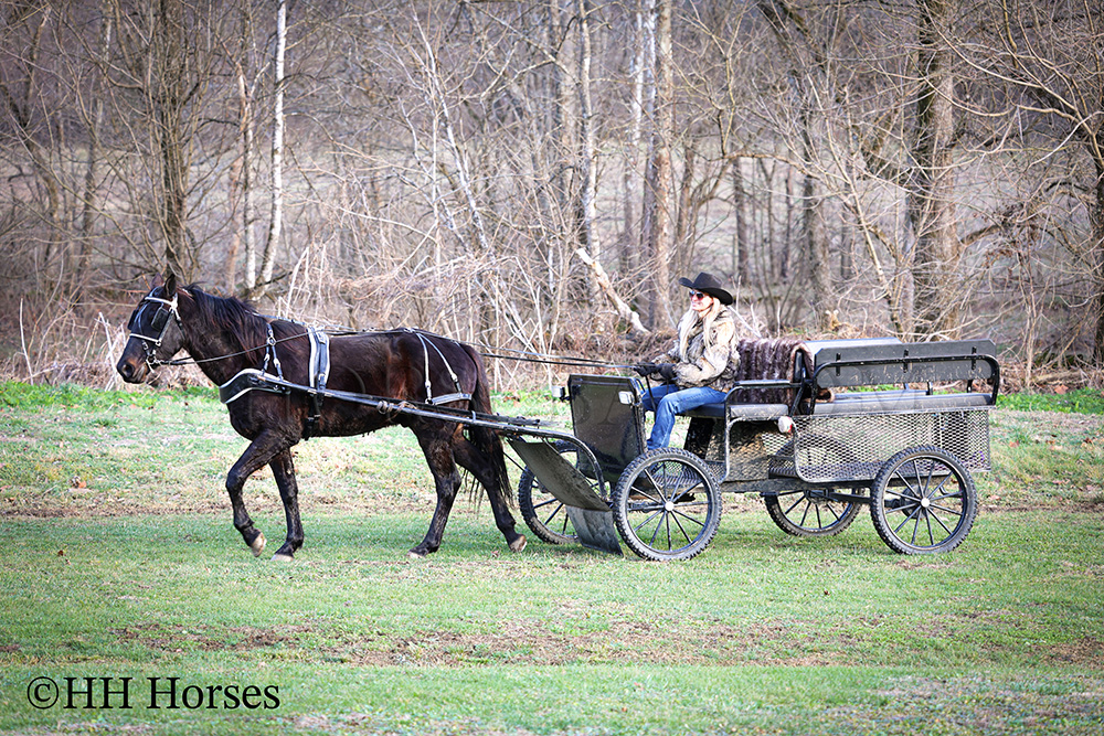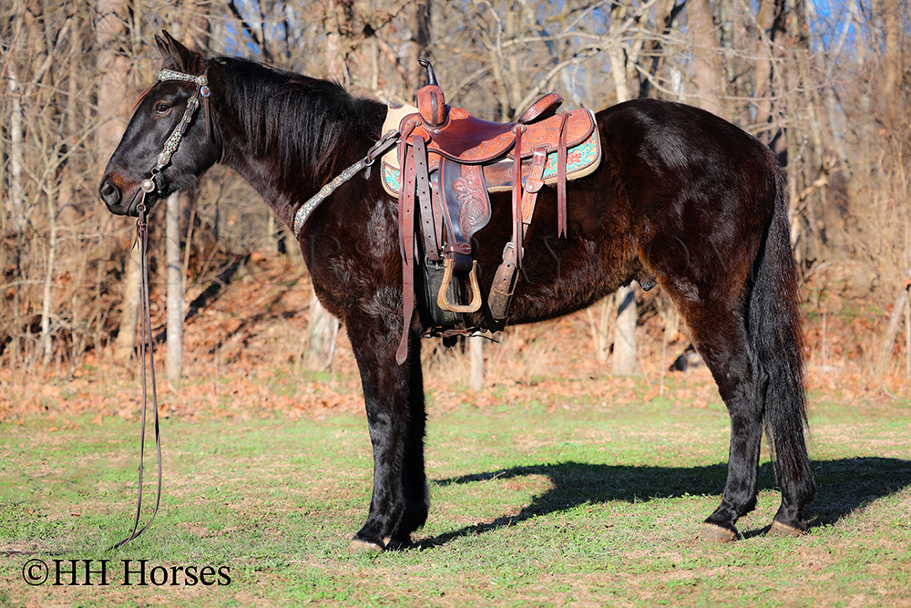 This is “PHOENIX”, a spectacular, seasoned, solid, and experienced DARK BAY MORGAN QUARTER HORSE CROSSBRED GELDING that is broke to ride and drive. He stands 15.2 hands tall and is 5 years old. This nice gelding is quiet, safe, honest, predictable, and dependable. He has been used for packing wild game out of the mountains on hunting excursions, he has been driven through the cross-country driving courses, been shown in the hitch classes, driven to town, ridden English and Western in and out of the arena, and he has been trail ridden in all sorts of terrains. He has been in the steep mountains, through the deep waters, through the rocky stream beds, and he has been in the pastures to check cattle. He is sure-footed and knows how to hold back when going down steep hills. This gelding aims to please; he will go anywhere you point him under saddle or harness, and it won’t get too deep or too steep for him. He is confident, rides alone bravely, and performs well in a group. He doesn’t mind leading the pack or bringing up the rear. He is constant, steady, and true. This gelding will ride relaxed on a loose rein and will not go any faster than you ask of him. He drives for novice and beginner teamsters. Schoolchildren have driven him to school without issues. He is easy to stop, turn, and maneuver in tight spots. He stands tied quietly; he stands to harness, hitch, tack, mount, and groom. This gelding is accustomed to children running around the barn; he is fine with dogs trailing his heels, and he is relaxed and calm in new, unfamiliar situations. He is the type of horse that loves attention and stays quiet even when his surroundings become chaotic. He has been ridden and driven on the moonlight rides. He is a versatile, docile, well-rounded young gelding with extensive experience and remains gentle. He genuinely loves people and has a pleasant personality. He gets along well with other horses. He stands for a bath, loads and unloads quietly, and has excellent ground manners. View his video and contact Erin with any questions.