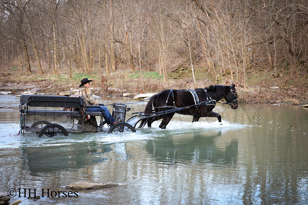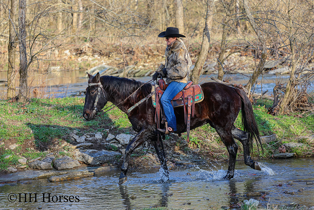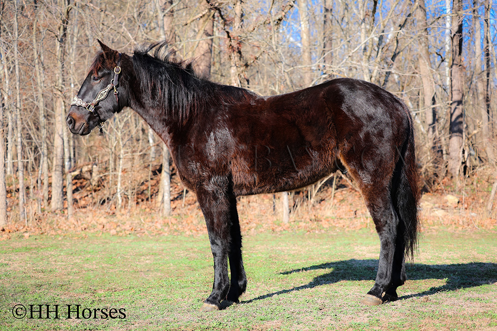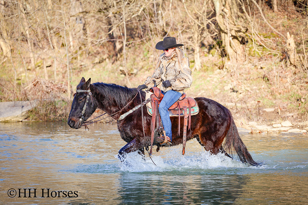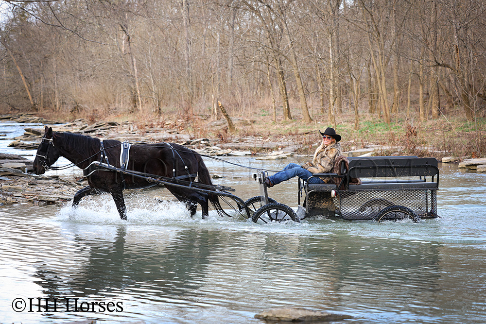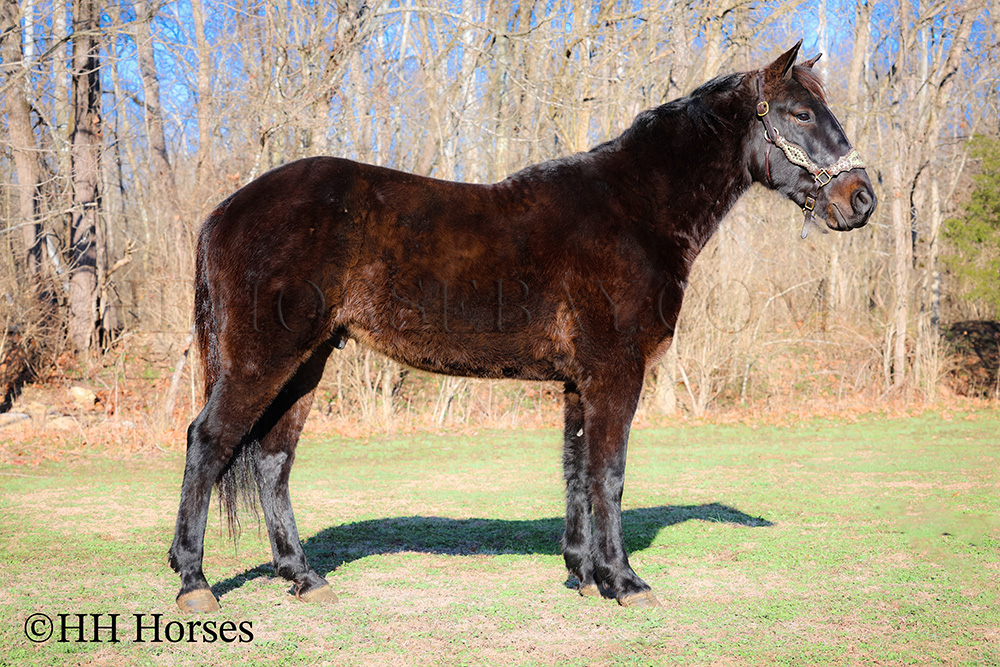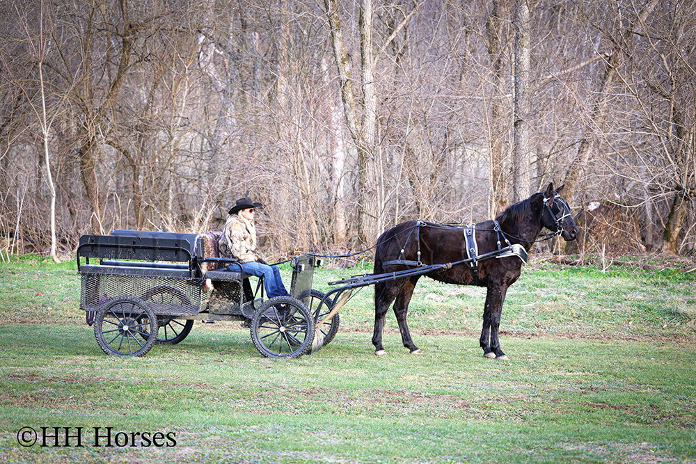 This is “PHOENIX”, a spectacular, seasoned, solid, and experienced DARK BAY MORGAN QUARTER HORSE CROSSBRED GELDING that is broke to ride and drive. He stands 15.2 hands tall and is 5 years old. This nice gelding is quiet, safe, honest, predictable, and dependable. He has been used for packing wild game out of the mountains on hunting excursions, he has been driven through the cross-country driving courses, been shown in the hitch classes, driven to town, ridden English and Western in and out of the arena, and he has been trail ridden in all sorts of terrains. He has been in the steep mountains, through the deep waters, through the rocky stream beds, and he has been in the pastures to check cattle. He is sure-footed and knows how to hold back when going down steep hills. This gelding aims to please; he will go anywhere you point him under saddle or harness, and it won’t get too deep or too steep for him. He is confident, rides alone bravely, and performs well in a group. He doesn’t mind leading the pack or bringing up the rear. He is constant, steady, and true. This gelding will ride relaxed on a loose rein and will not go any faster than you ask of him. He drives for novice and beginner teamsters. Schoolchildren have driven him to school without issues. He is easy to stop, turn, and maneuver in tight spots. He stands tied quietly; he stands to harness, hitch, tack, mount, and groom. This gelding is accustomed to children running around the barn; he is fine with dogs trailing his heels, and he is relaxed and calm in new, unfamiliar situations. He is the type of horse that loves attention and stays quiet even when his surroundings become chaotic. He has been ridden and driven on the moonlight rides. He is a versatile, docile, well-rounded young gelding with extensive experience and remains gentle. He genuinely loves people and has a pleasant personality. He gets along well with other horses. He stands for a bath, loads and unloads quietly, and has excellent ground manners. View his video and contact Erin with any questions.