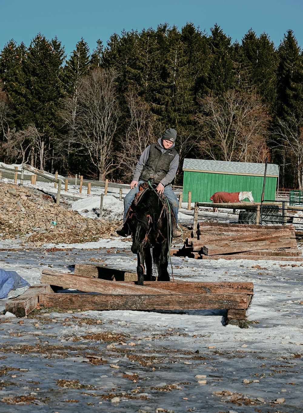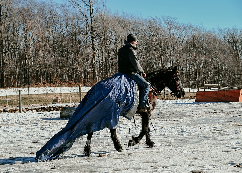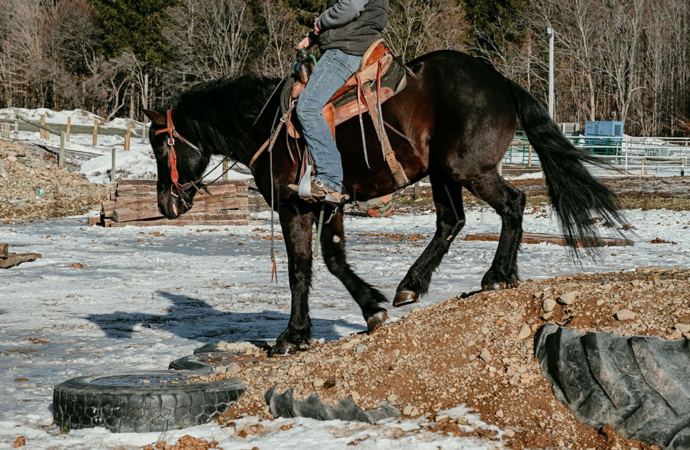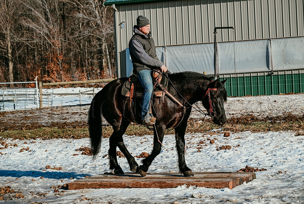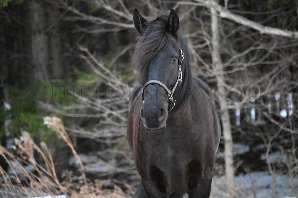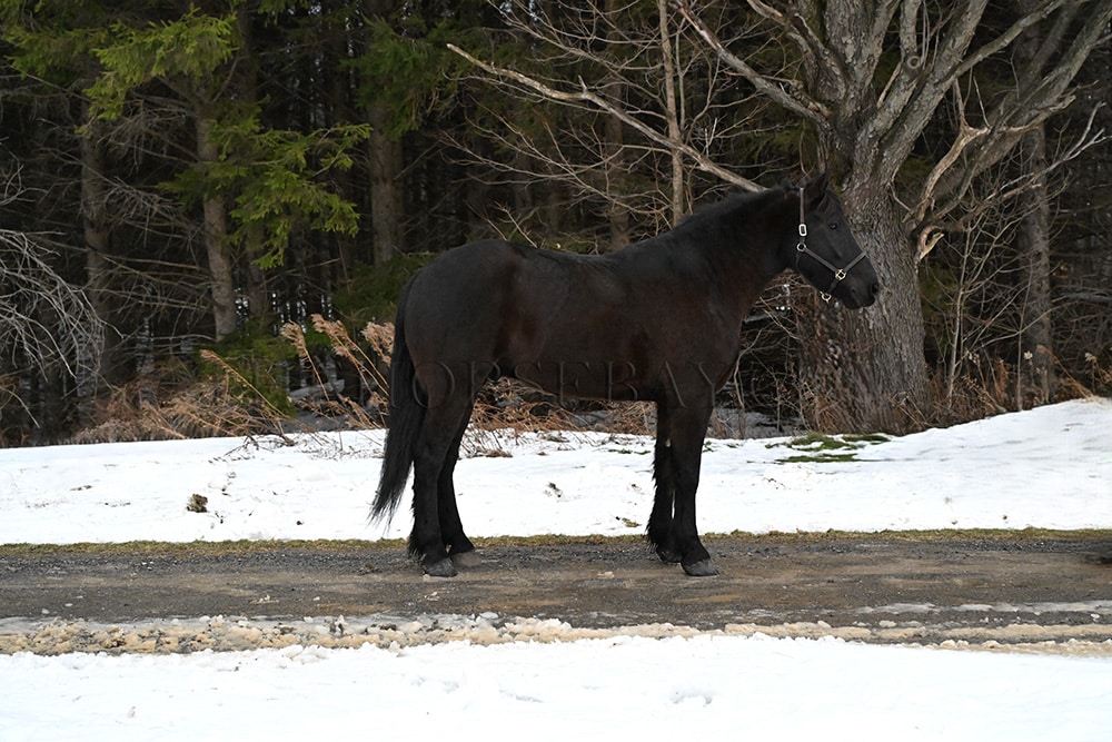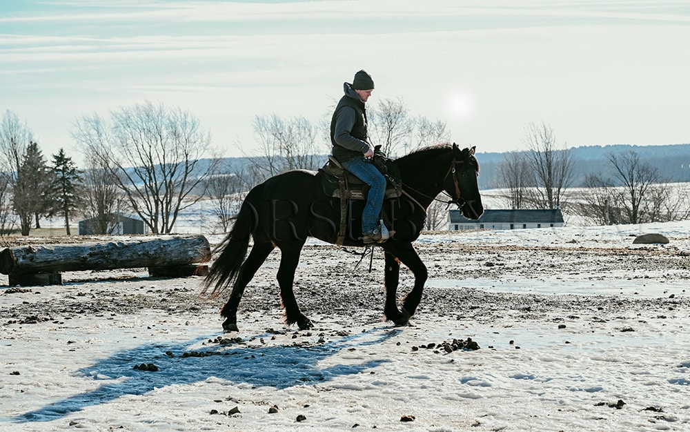“Rocco” is a 6-year-old, 16-hand Friesian cross gelding. He is the first one to meet you at the gate and loves to be right in your pocket. He is a great size for a wide range of riders. Rocco will side-pass to you at the mounting block and wait patiently for you to get on. He is not fazed by tarps, the bullwhip, flags, or anything else we throw his way. He has been ridden in English, Western & bareback. He is quiet and enjoyable to ride. From complete beginners to advanced riders, riders have trained him on the trails and in the arena. He loves the trails! Water, rocky terrain, steep hills, and bridges, nothing will bother this horse. Rocco will confidently ride down a busy road, unfazed by the surrounding traffic. He knows his leads and has an excellent whoa. Rocco will also drive. He has been hooked in the carriage and on the sleigh. He will stand patiently while being hitched up, and when you are getting in and out of the carriage! Rocco is always eager to work and please his owner. He has a puppy dog personality and gets along with mares and geldings in the pasture. He stands for the vet, farrier, or just to be loved on and groomed. He has been removed from the property many times and is the same off the property as he is on it. He sells 100% sound with no vices. PPE is welcome at the buyer’s expense. Contact Dayton for more information! We are located in Warsaw, NY!