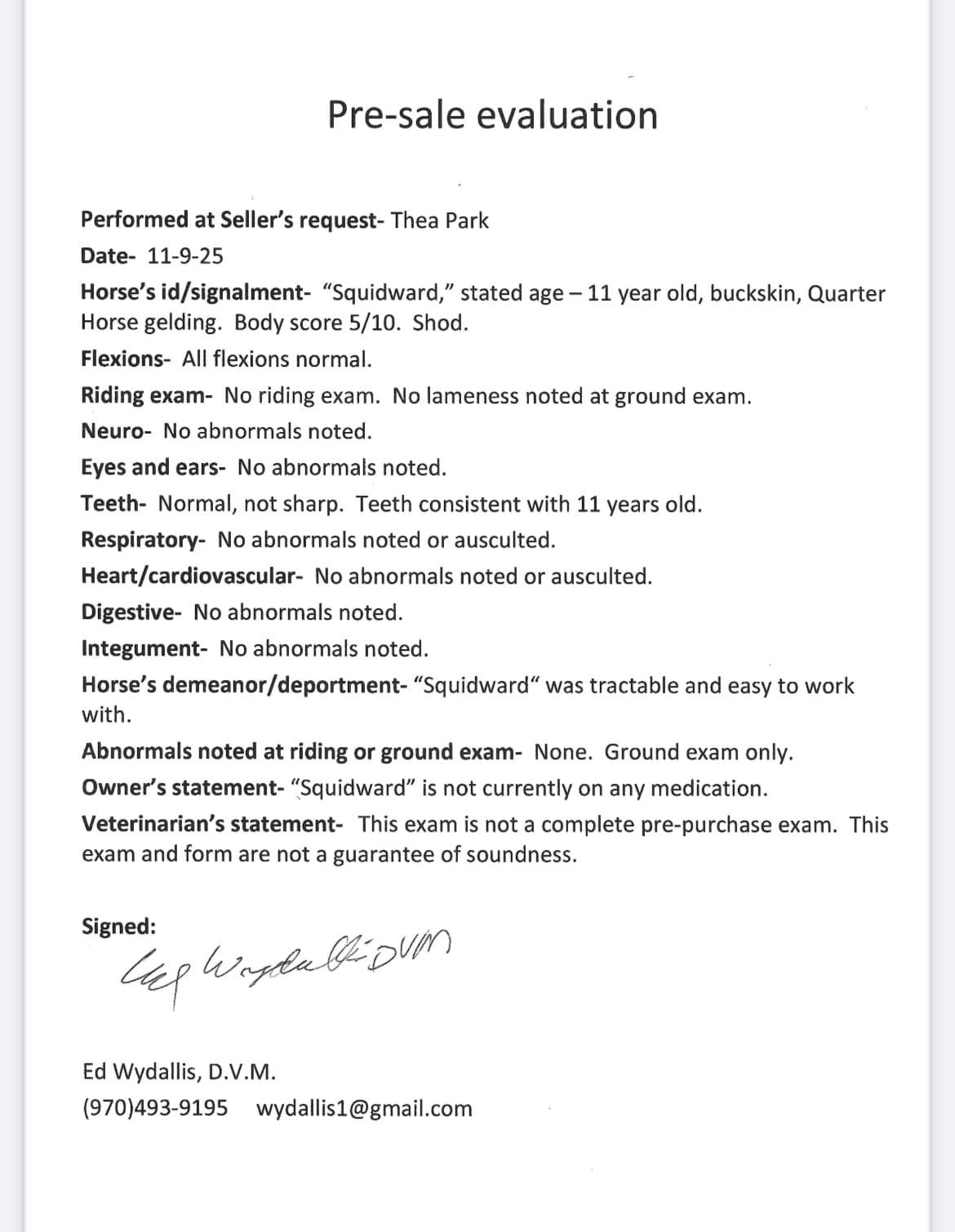 If you’re looking for a seasoned gelding with endurance, a calm mind, and a go-all-day work ethic, Squidward checks all the boxes. He’s ready for your next branding, big mountain ride, or weekend job.