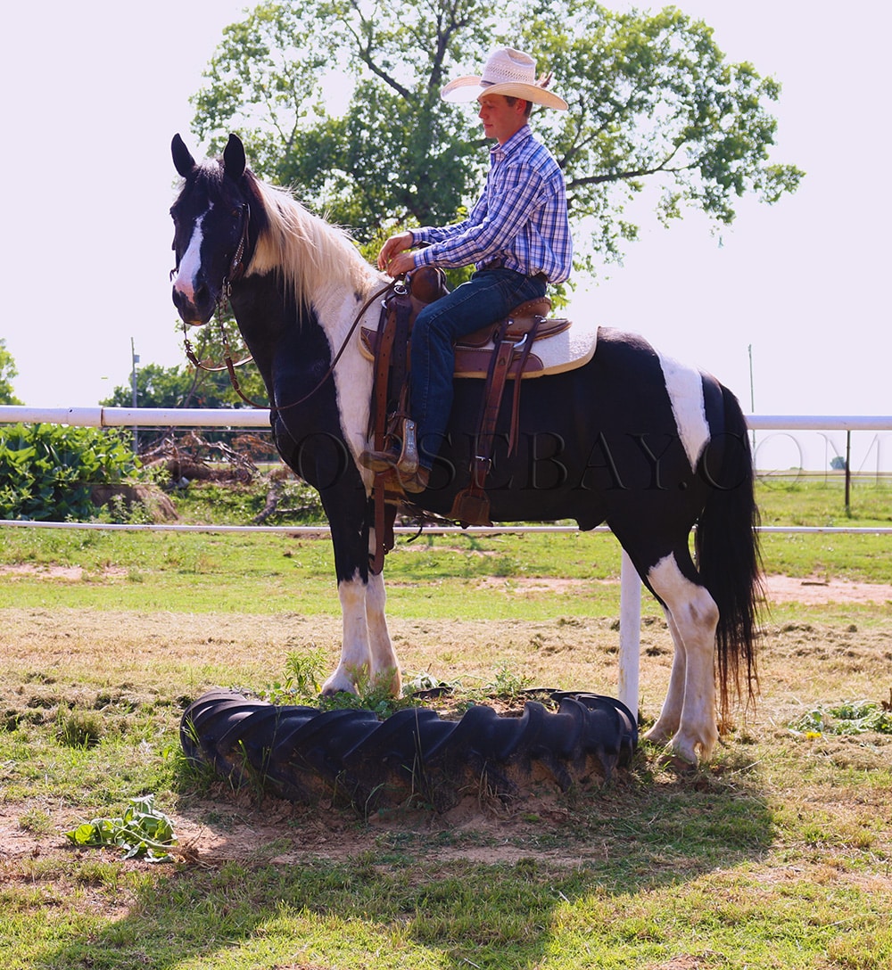Are you ready to experience trail riding excellence? Look no farther than “Traveler”, a breath-taking 14.2 half-Draft Cross/half-Tennessee walking horse gelding whose striking black and white coat sets him apart. He will turn heads everywhere you go. A 70-year-old lady has ridden him more miles than she can count. He is an in-your-pocket type of horse. Every time you walk out to pasture, he will come to see what you are doing. You can catch him anywhere. He is very gentle. He is 13 years old and will load in trailer very well. He will go over logs and rocks. He will go through water. He is great with the tarp, carries the flag, and will drag anything behind him. He is not spooky and is the same horse every time you get on him. Let him sit for months and he will be the same horse when you saddle him up. No buck, bite, or funny business. Anybody can ride him. Traveler is very smooth and 100% sound. He is everything you would want in a trail horse. Have any questions? Cal Al.