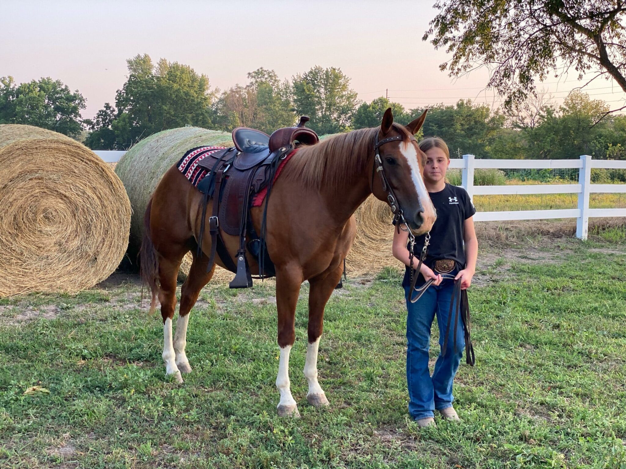 WR IMA Barbie Girl is a 2017 double-registered AQHA/APHA mare. She stands 14.1 and is thick as she is tall. She is a gorgeous sorrel with four white socks and a strip on her face. This horse will be sure to get everyone’s attention. With halter and performance bloodlines, she has the looks and build only one would dream of. Barbie has the best ground manners of any horse I’ve ever had the pleasure to handle. She is very easy and respectful on the ground. She maintains her space and stays out of yours. She stands tied all day without a fuss, catches you in the pasture, and comes on the run when called, clip her without even a halter, bathe her untied, saddle and bridle her untied as well, and she won’t move a muscle. Under saddle, she is not spooky; she’s quiet, calm, and great-minded. She had a later start in life due to no fault of her own, but she has seen it all! While we have used her as a trail horse for the last two years, we have also introduced her to pretty much everything! Show her something new, and she will take it in stride. She will trail ride anywhere, over or through anything. Logs, brush, steep terrain, water up to her head, no problem. Down the road, no problem. She knows arena work, has pushed cows, and loves it! She has sorted and had a rope thrown off her. Obstacles are no problem either. Bridges, cones, poles, barrels- she has seen it all; it doesn’t phase her. She also comes with all the buttons. She has a great stop, backs with ease, side pass, pivot, and moves off light leg pressure, or if you prefer, just neck rein her around. This quiet, calm, easy nature horse is full of potential and will be your next all-around horse. Take her home and head straight to the trails or campgrounds. Use her on the ranch to push cattle, and she will get right after them. Or finish her arena work or make her a rope horse! She will do it all! At home, we use tractors, golf carts, ATVs, utvs, and a skid loader to complete various tasks in which she has seen them all! In addition, the 5 grandkids jump onto horses around her as well. You will see a 10-year-old girl riding in the video.